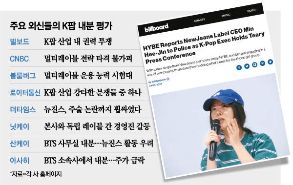 25일(현지시간) 미 음악매체 빌보드는 한국 매체들을 인용해 민 대표의 기자회견 현장 분위기까지 자세하게 다뤘다. 빌보드는 “하이브가 민 대표를 경찰에 고발할 계획을 밝혔고, 민 대표는 ‘눈물의 기자회견’을 열었다”면서 이번 사태를 “K팝 내 권력 투쟁”이라고 보도했다.