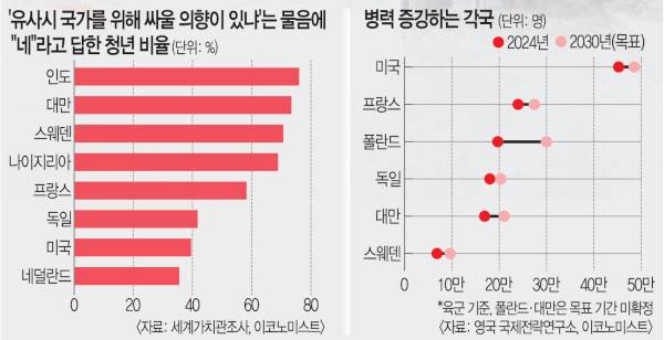 러시아와 지리적으로 가까워 실존적 위협을 체감하는 동·북유럽 국가들은 대체로 징병제에 동의하는 분위기다. WVS 조사에서 덴마크, 핀란드, 노르웨이, 스웨덴은 응답자 3분의 2 이상이 유사시 기꺼이 참전할 의향이 있다고 답했다.