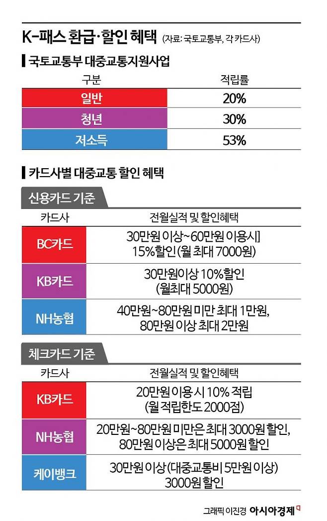 소비패턴에 따라…카드사 및 신용·체크카드 골라야K-패스 카드는 KB국민, NH농협, BC(BC바로, 광주은행, IBK기업은행, 케이뱅크), 삼성, 신한, 우리, 하나, 현대, DGB유페이, 이동의 즐거움(모바일 이즐, 카카오페이 모바일교통카드) 등 10개 카드사에서 발급된다. 대중교통 할인혜택은 10~20%로, 정부 환급 지원금(20~53%)과 합치면 교통비 부담이 더 줄게 된다.