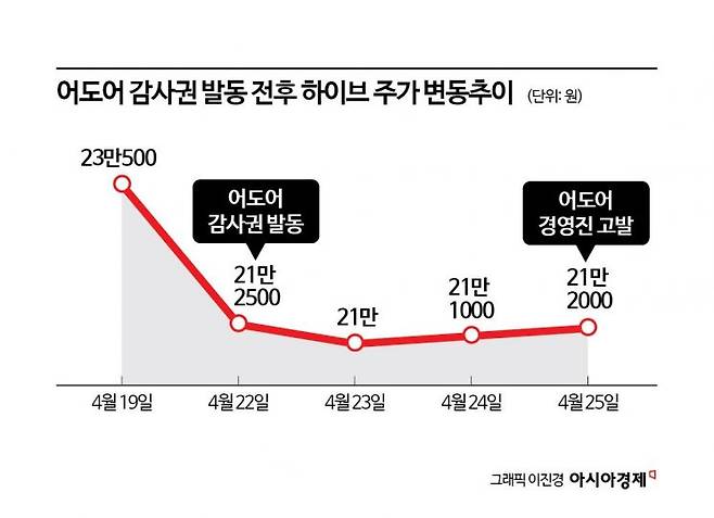 법적 분쟁이 본격화되면서 하이브 주가 또한 변동성이 커지고 있다. 하이브가 어도어에 대한 감사권을 발동한 지난 22일 전후 하이브의 주가는 8% 이상 등락하면서 시총도 8000억원 이상 감소해 불안정한 흐름을 보이고 있다.