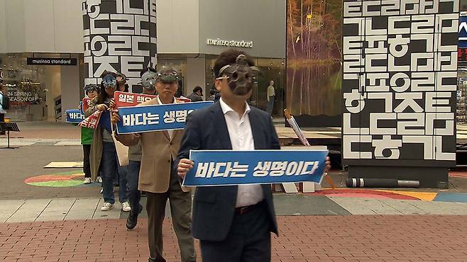 손에는 '바다는 생명', '일본의 핵 오염수 방류 반대한다' 등의 문구가 적힌 작은 현수막도 들었습니다.