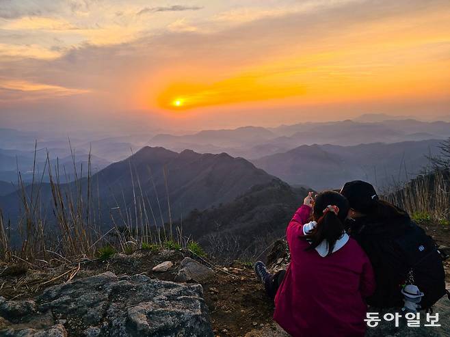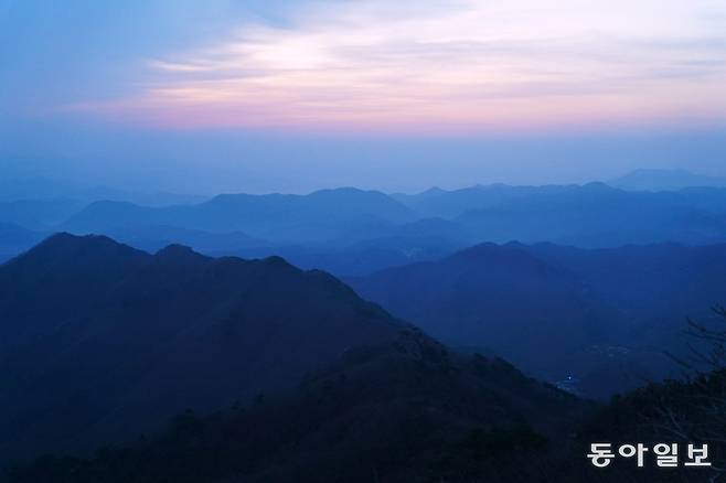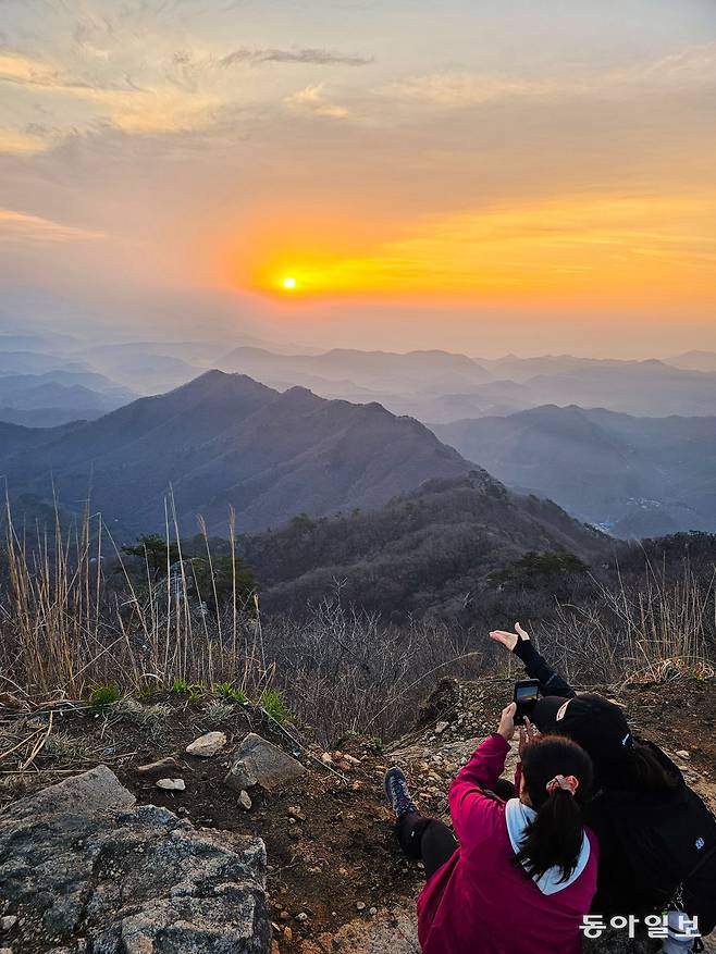 진달래가 피어 있는 능선을 지나니 드디어 낙조대 정상이다. 첩첩이 싸여 있는 산들이 어깨동무를 하며 앞서거니 뒤서거니 떠다닌다. 그 안에 불그스름한 해의 기운과 푸른 산의 기운이 이리저리 흘러다닌다.