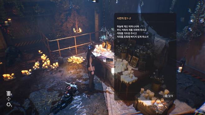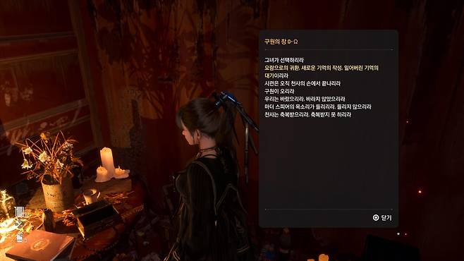 퀘스트 문구에서도 '기도하는 곳'을 언급했으니까 분명 관련이 있을 것이라고 확신했다. 마침 정보 파트에서도 '기도문의 암호'를 발견할 수 있었다. "앞으로 게임을 즐길 때 사소한 요소나 텍스트를 꼼꼼하게 읽는 습관을 길러야겠다"고 반성하는 계기였다.