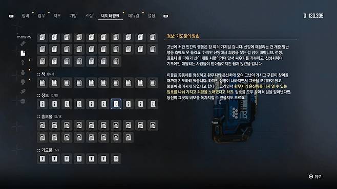 목표를 다시 정했다. 모든 데이터뱅크를 수집하자. 데이터뱅크 관련 트로피 획득 조건이 메모리스틱, 암호, 정보 중 200개 수집이다. 메모리스틱만전부 수집해도 200개 가까이 되니까 정보 섹션을 전부 수집하는 것은 생각하지 않았던 영역이다.