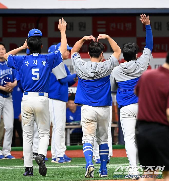 27일 고척스카이돔에서 열린 삼성과 키움의 경기, 삼성이 11대0으로 승리하며 2연승을 달렸다. 경기 종료 후 기쁨을 나누는 삼성 선수들의 모습. 고척=허상욱 기자wook@sportschosun.com/2024.04.27/