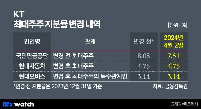 통신기업 KT의 최대주주가 최근 국민연금에서 현대차그룹으로 변경됐습니다.
