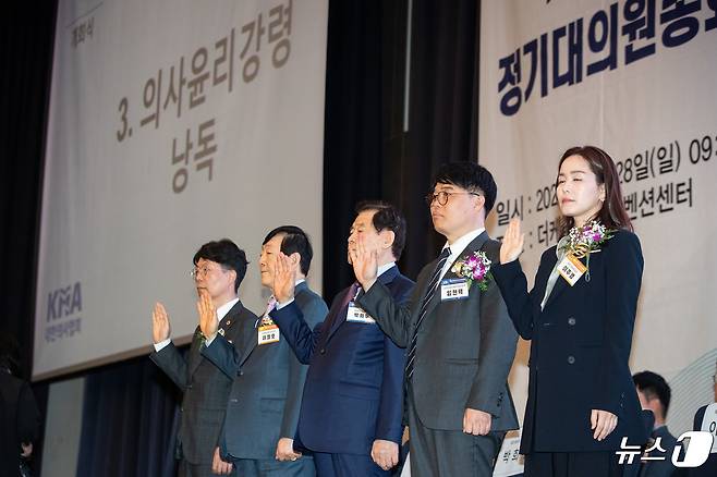 (서울=뉴스1) 유승관 기자 = 임현택 대한의사협회장 당선인(오른쪽 두 번째)을 비롯한 참석자들이 28일 서울 서초구 더케이호텔에서 열린 대한의사협회 제76차 정기대의원총회에서 의사윤리강령을 낭독하고 있다. 2024.4.28/뉴스1