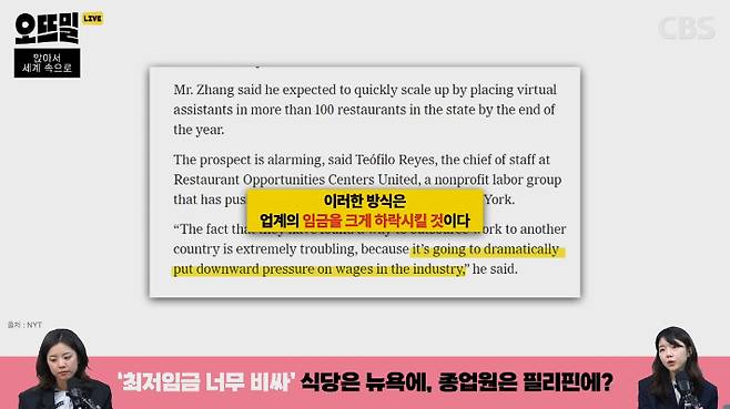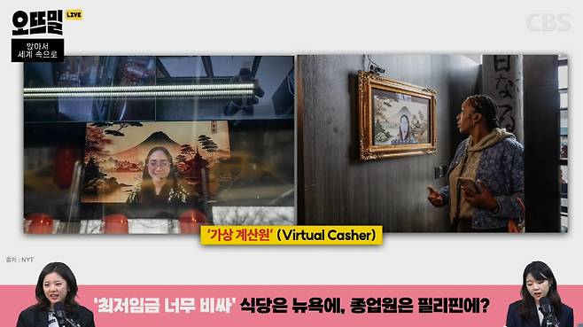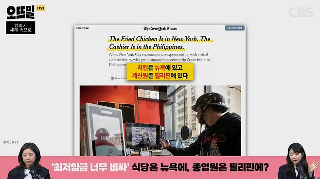 ◆ 박수정> 맞아요. 실제로 이 계산원 직원은 뉴욕에서 10,000km 이상 떨어진 필리핀 현지에서 근무하고 있다고 하는데요. 해당 계정에 올라온 이 가게뿐만 아니라 요즘 뉴욕 시내의 몇몇 가게들에서 이렇게 필리핀 같은 다른 나라에서 원격으로 직원이 근무하고 있다고 합니다. 뉴욕타임스에서 이런 현상을 지난주에 보도했는데요. 그 기사의 헤드라인이 '치킨은 뉴욕에 있고, 계산원은 필리핀에 있다'입니다.