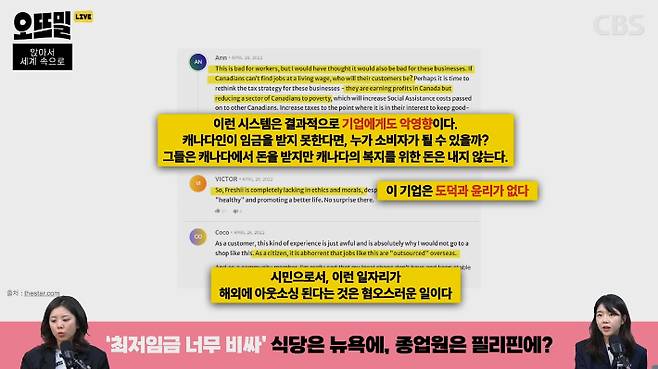 캐나다 누리꾼들은 '이런 곳에서 소비하지 말아라, 캐나다에서 사업을 하려면 캐나다인을 고용해라' 이런 반응을 보였고요. '캐나다인들이 임금을 받지 못하면 누가 그 가게에 가서 사 먹겠느냐'는 얘기도 있었습니다. 또 '이런 편법을 이용하는 업체들에 세금을 더 많이 부과해야 한다'는 의견도 있었습니다. 그리고 '도덕적으로 윤리적으로도 옳지 못하고 시민으로서 이런 일자리가 해외에서 아웃소싱 된다는 거 굉장히 혐오스럽다'는 비판도 있었고요. 이렇게 역풍을 맞으니까 결과적으로 1년이 지나고 2023년에 프레시가 결국 이 정책을 중단했습니다.