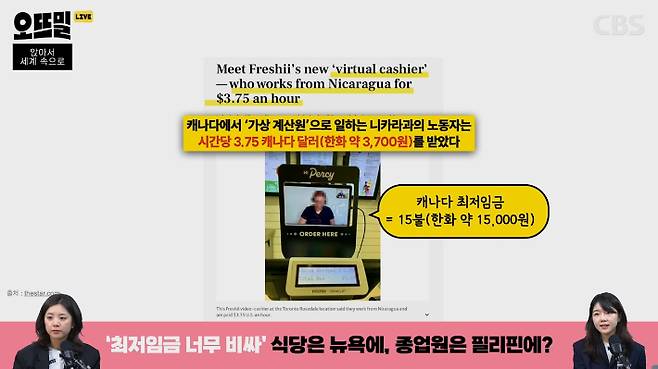 ◆ 박수정> 뉴욕타임스에서도 이 서비스로 인해서 생겨날 문제점들을 지적하고 있습니다. 팬데믹 이후에 이미 요식업 종업원 수가 줄어든 상황에서 더 많은 현지 일자리가 없어질 것이라는 게 첫 번째 지적인데요. 사실 비슷한 사례가 캐나다에서 이미 2022년에 있었습니다. 캐나다에 굉장히 큰 기업 프랜차이즈 식품업체 프레시라는 곳이 있는데 이곳에서 인건비를 줄이기 위해서 중앙아메리카에 위치한 니카라과의 노동자들을 가상 종업원으로 고용했습니다. 얼마나 전격적으로 고용을 했냐면 아예 계산기에 작은 모니터를 하나씩 다 달아서 제작을 직접 했고요. 여기에 펄시(Percy)라는 이름을 붙여주기도 합니다. 캐나다에서는 최저임금이 캐나다 달러로 15불이거든요. 근데 이 가상 종업원들에게는 3.75불 정도를 줬다고 해요.