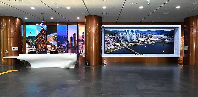 (서울=연합뉴스) 서울시가 서울 중구 서울시청 1층 로비를 12년 만에 리모델링하고 오는 29일부터 새로운 모습으로 시민을 맞이한다고 28일 밝혔다. 사진은 서울시청 안내데스크 미디어월 전경. 2024.4.28 [서울시 제공. 재판매 및 DB 금지]