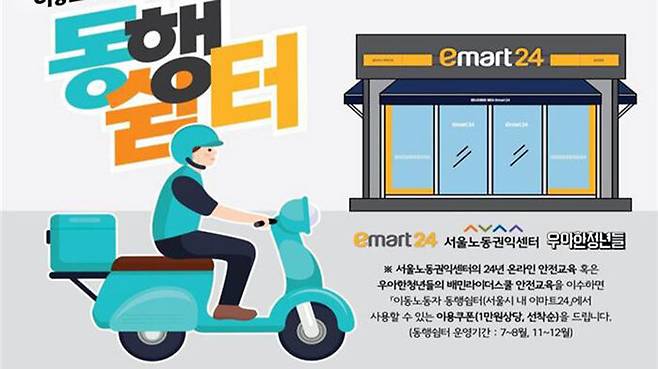 서울노동권익센터와 이마트24, 우아한청년들은 지난 25일 '이동노동자 편의점 동행쉼터 운영 업무협약'을 맺고 편의점 동행쉼터를 조성하기로 했다고 오늘(28일) 밝혔습니다.
