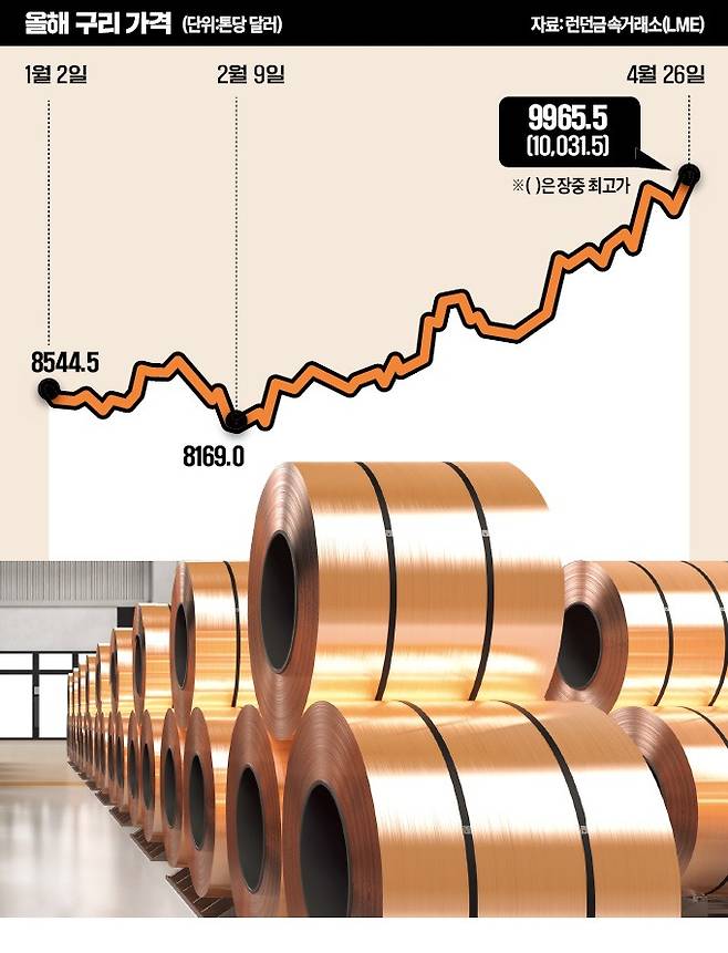 27일(현지시간) 런던금속거래소(LME)에 따르면 구리 선물(3개월물) 가격은 전날 장중(오후 5시께) t당 1만31.50달러를 기록해 2022년 4월 후 처음으로 1만달러를 넘겼다. 종가는 9965.5달러로 1만달러에 근접했다. 지난 1년여간 t당 8000~8500달러 선에서 움직였던 구리 가격은 지난달부터 큰 폭으로 상승하기 시작해 이달 t당 9000달러를 돌파했다. 올해 들어서만 16.4% 올랐고 연저점(2월 9일·8169달러)보다는 21.9% 뛰었다.