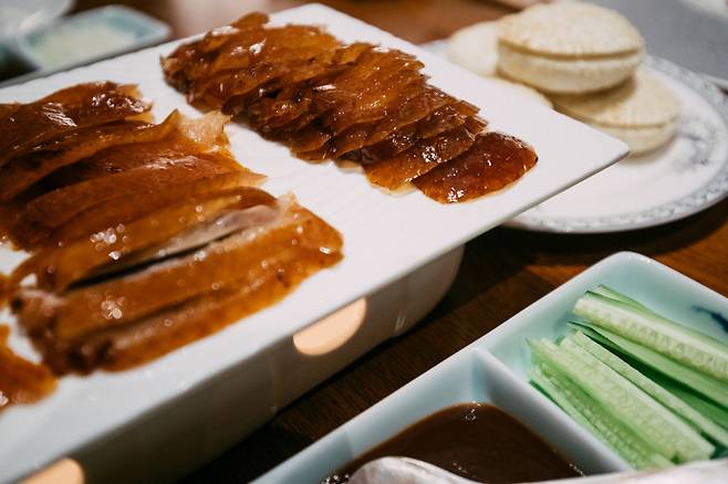 베이징덕의 포인트는 균일한 껍질 색이다. 오리를 굽기 전 공기를 주입해 오리의 껍질과 고기 사이에 공기층을 만든다. 내부에 있는 수분을 바싹 말린 뒤 오리 껍질에 설탕이나 물엿을 입혀 구워낸다. 그리하여 은은한 황금빛 오리 껍질이 완성되는 것이다.