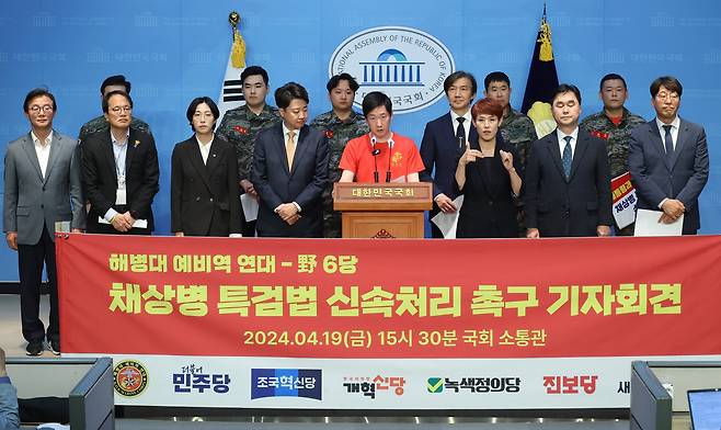 | ▲ 더불어민주당 박주민, 전재수 의원, 조국혁신당 조국 대표, 개혁신당 이준석 대표, 녹색정의당 장혜영 의원, 진보당 강성희 의원, 새로운미래 김종민 의원, 해병대예비역연대 정원철 회장과 회원들이 지난 19일 오후 서울 여의도 국회 소통관에서 기자회견을 열어 호우피해 실종자 수색 작전 중에 발생한 해병대 고 채 상병 순직 사건에 대한 특검법 통과를 촉구하고 있다. |