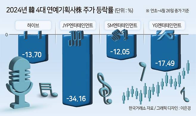 29일 한국거래소에 따르면 지난 26일 종가 기준 4월 들어 4대 연예기획사주 모두 급락세를 면치 못하고 있다. 하이브의 주가가 12.39%나 하락했고, 그 뒤를 YG엔터테인먼트(-10.83%), SM엔터테인먼트(-7.74%), JYP엔터테인먼트(-7.49%) 순서로 따랐다.