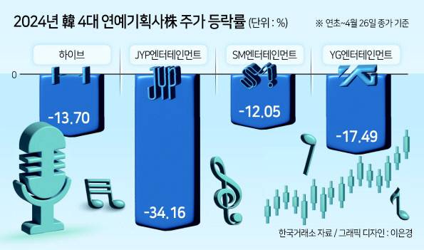 올해 연중으로 범위를 넓히면 낙폭은 더 커진다. JYP엔터테인먼트의 주가 등락률이 -34.16%로 가장 부진했고, YG엔터테인먼트(-17.49%), 하이브(-13.70%), SM엔터테인먼트(-12.05%) 모두 두 자릿수 하락세를 나타냈다.