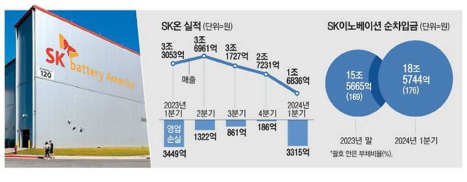 SK온이 올해 1분기에 3000억원이 넘는 영업적자를 기록했다. 매출은 직전 분기보다 1조원 이상 줄었다. 지난해 1분기 대비로는 절반 수준이다. SK온은 자금난 타개를 위해 1조원 규모 투자 유치도 추진한다.