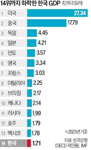 지난해 한국의 국내총생산(GDP)이 세계 14위권으로 1년 전보다 한 단계 또 추락했다. 중남미 멕시코보다 뒤진 순위로, 2012년 이후 11년 만에 가장 낮다. 잠재성장률을 끌어올리기 위한 구조개혁이 시급하다는 지적이 나온다.