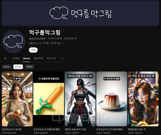 1위를 차지한 '먹구름막그림'은 구독자 11만 명, 누적 조회 수 6800만 회를 보유한 채널이다. 지난해 12월 개설된 이 채널은 시작부터 뜨거운 반응을 끌어내며 4개월여 만에 구독자 10만 명을 돌파하는 신기록을 썼다. 주력 콘텐츠는 챗GPT를 활용한 AI 그림이다. 극단적 상황을 그려달라는 무리한 요청에도 재치있게 대응하는 AI의 모습을 담거나, 기존의 인물·동물·사물에 상상력을 더해 현실에 없는 가상의 존재를 그려내는 식의 콘텐츠가 주를 이룬다. 채널의 대표 영상은 '인공지능아, 더 벗겨줘', '인공지능아, 더 위험하게 해줘', '챔피언 성별 바꾸기' 등으로, 최고 600만 회에 이르는 조회 수를 올리고 있다.