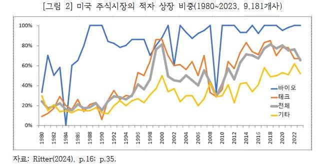 이런 제도 때문에 미국 주식시장은 적자 상장이 일반화돼 있다. 플로리다 대학의 제이 리터(Jay R. Ritter) 교수가 매년 발표하는 ‘기업공개-업데이트 통계(Initial Public Offerings: Updated Statistics)’ 최신판에 따르면 1980년~2023년 사이 뉴욕증시(NYSE)와 나스닥에 주당 5달러 이상의 가격으로 상장한 9181개 기업 중 적자 기업은 42%였다[그림 2].