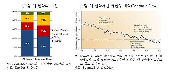 1976년 유전자 재조합 기술의 상업화를 위해 제넨텍(Genentech)이 창업된 이후, 바이오 스타트업은 신약개발 생태계에서 매우 중요한 역할을 담당해 왔다. 1998~2007년 사이 미국 식품의약국(FDA)의 허가를 받은 252개의 신약 중 34%가 바이오 스타트업을 거쳐 개발됐고 혁신적인 신약의 경우 그 비중이 48%로 늘어났다[그림 1].