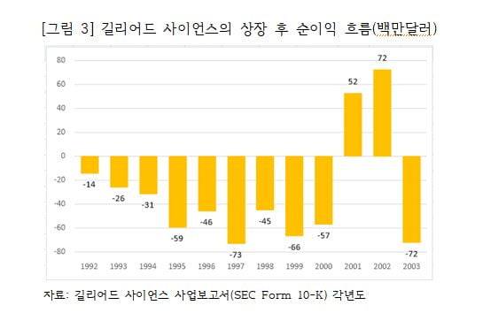 바이오 기업은 상장 후에도 수년간 적자 상태를 유지하는 것이 일반적이고, 적자 기간이 10년을 넘기는 경우도 많다. 타미플루로 유명한 길리어드사이언스는 1987년 설립 후 1992년 IPO를 했지만 순이익이 흑자로 돌아선 것은 설립 후 14년, 상장 후 9년이 지난 2001년이었다[그림 3]. 이런 패턴은 바이오 기업들에서 예외적으로 나타나는 현상이 아니고 일반적인 모습이다.