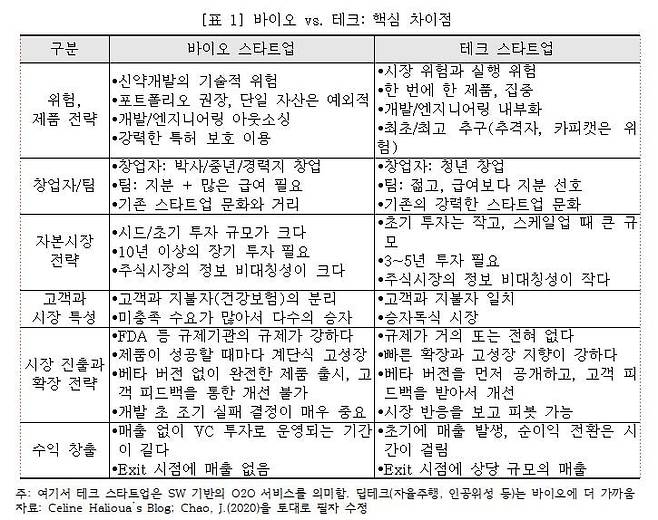 자본시장에서 바이오 기업이 겪는 이러한 문제는 IT 분야의 테크 스타트업과 바이오 스타트업의 차이에 그 원인이 있다[표 1]. 우선 신약 개발이 지닌 본원적 불확실성이 바이오 스타트업을 일반 테크 스타트업과 구별해주는 가장 중요한 차이라고 할 수 있다.