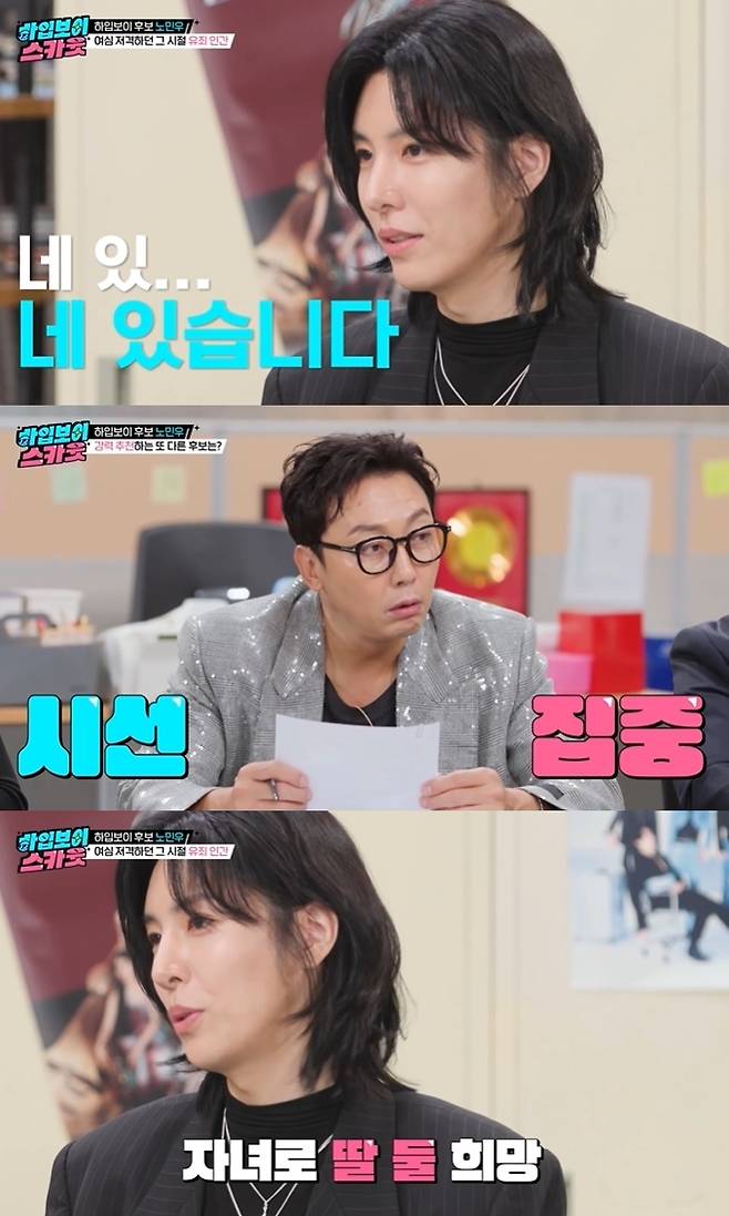 노민우는 "연애를 할 마음은 있고, 언젠가 딸 둘을 낳고 싶다"며 희망 자녀 계획을 밝히기도.