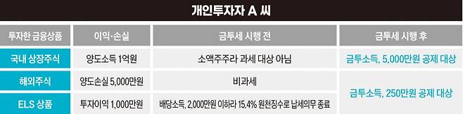 개인투자자 A 씨를 가정해보자. A 씨가 국내 주식을 양도해 1억원 이익, 해외주식 양도로 5000만원 손실, 파생결합증권(ELS) 투자로 1000만원을 벌었다면 이익과 손실을 상계한 6000만원이 과세 대상인 금융투자소득금액이다.