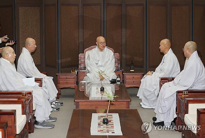 (서울=연합뉴스) 이재희 기자 = '뉴진'이라는 법명으로 활동하는 개그맨 윤성호(오른쪽 두번째)가 30일 오전 서울 종로구 한국불교역사문화기념관에서 조계종 총무원장 진우스님(가운데)과 대화를 나누고 있다. 2024.4.30