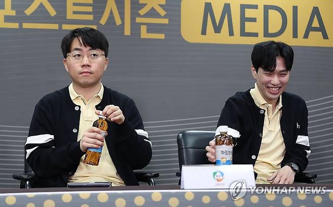 (서울=연합뉴스) 김성민 기자 = 30일 오전 서울 성동구 한국기원에서 열린 2023-2024 KB국민은행 바둑리그 포스트시즌 미디어데이에서 울산 고려아연 신민준(왼쪽)과 박승화 감독이 참석해 있다. 2024.4.30