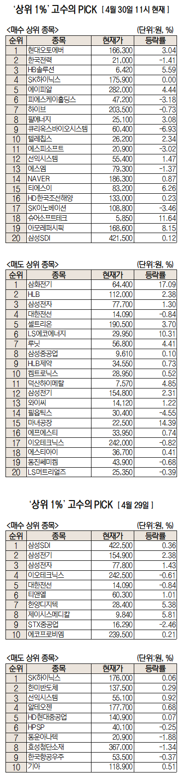 이날 미래에셋증권에 따르면 미래에셋증권 주식 거래 고객 중 최근 1개월 간 투자수익률 상위 1%에 해당하는 '주식 초고수'들이 오전 11시까지 가장 많이 사들인 종목은 현대오토에버로 집계됐다.