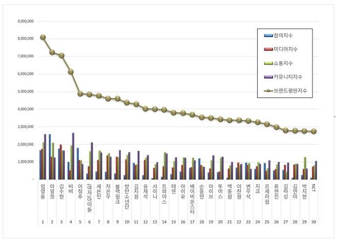 스타 브랜드평판 1위를 기록한 임영웅 브랜드는 참여지수 1,662,699 미디어지수 1,733,669 소통지수 2,123,365 커뮤니티지수 2,568,129가 되면서 브랜드평판지수 8,087,862으로 분석됐다. 지난 3월 브랜드평판지수 7,211,911과 비교해보면 12.15% 증가했다.