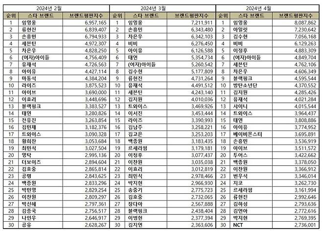 2024년 4월 스타 브랜드평판 30위 순위는 임영웅, 아일릿, 김수현, 비비, 이정후, (여자)아이들, 세븐틴, 차은우, 블랙핑크, 방탄소년단, 김지원, 유재석, 샤이니, 트와이스, 태연, 아이유, 베이비몬스터, 손흥민, 아이브, 투어스, 백종원, 이찬원, 변우석, 지코, 르세라핌, 류현진, 김하성, 김연아, 박지현, NCT 순으로 분석됐다.