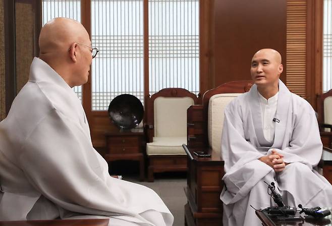 [서울=뉴시스] 김근수 기자 = 대한불교조계종 총무원장 진우 스님(가운데)이 30일 오전 서울 종로구 한국불교역사문화기념관에서 '뉴진'이라는 법명으로 활동하는 개그맨 윤성호와 대화를 나누고 있다. (사진 = 대한불교조계종 제공) 2024.04.30. photo@newsis.com