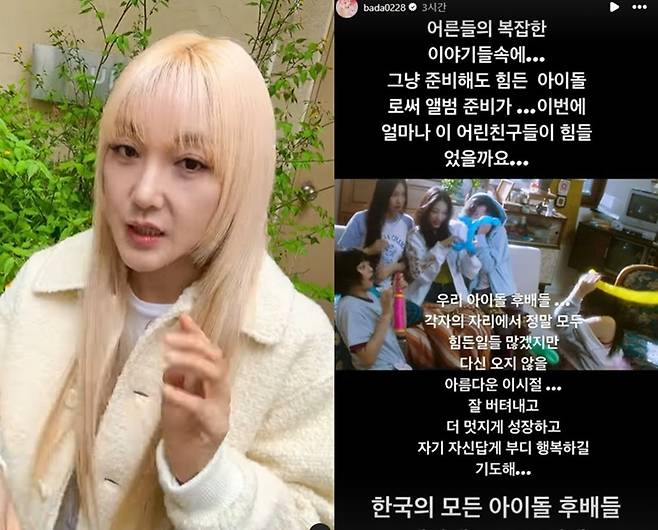 바다는 "우리 아이돌 후배들..각자의 자리에서 정말 모두 힘든일들 많겠지만 다신 오지 않을 아름다운 이 시절...잘 버텨내고 더 멋지게 성장하고 자기 자신답게 부디 행복하길 기도한다"라고 말했다. 그러면서 그는 "한국의 모든 아이돌 후배들 대단해. 모두 응원해"라고 덧붙였다.