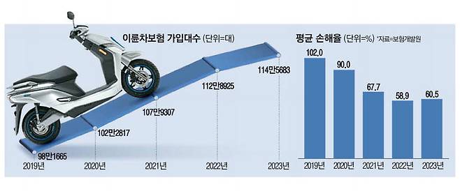 30일 보험개발원에 따르면 지난해 말 기준 이륜차보험 손해율은 60.5%로 집계됐다. 이륜차보험 손해율은 2019년까지만 해도 102%였다. 지급한 보험금이 계약자로부터 받은 보험료보다 많았다는 얘기다. 하지만 2021년 67.7%, 2022년 58.9% 등으로 이륜차보험 평균 손해율은 하향 안정세를 보이고 있다. 특히 2019년 137.7%까지 치솟았던 배달 오토바이(유상가입)의 손해율도 지난해 66.0%로 떨어졌다.