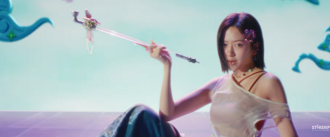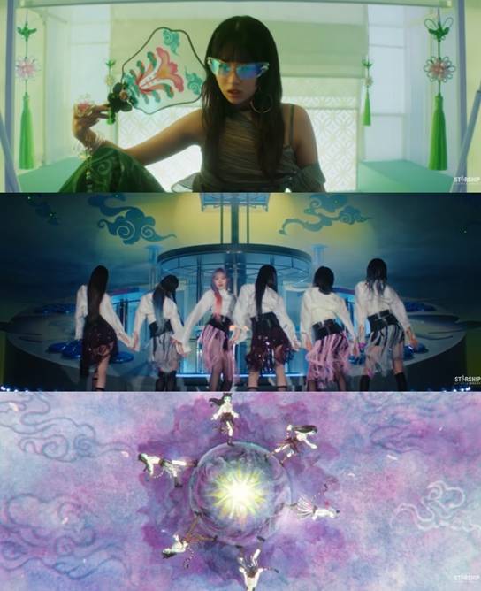 함께 공개된 뮤직비디오는 푸른 빛깔의 족자가 열리면서 시작된다. 곰방대를 든 안유진을 비롯해 멤버들은 동양적인 무드가 물씬 풍기는 의상을 트렌디하게 소화, 노리개 액세서리로 포인트를 주며 눈길을 끌었다.