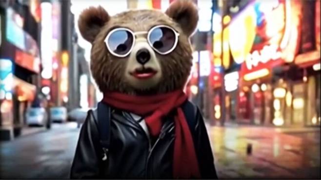미국 오픈AI의 소라가 만든 영상에 나온 모델을 패러디해 가죽 재킷과 선글라스를 착용한 곰이 거리를 걷는 영상도 내놨습니다.