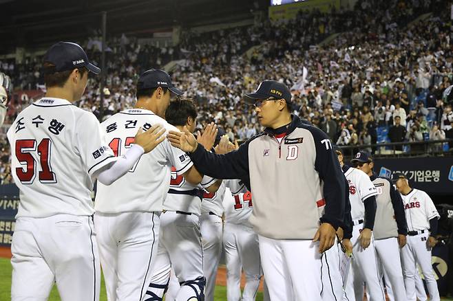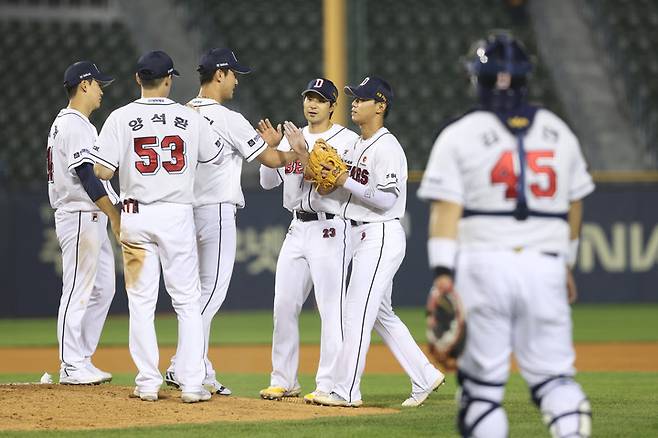 이아 9회초 홍건희가 마운드에 올라 대타 이성규에게 볼넷을 내주긴 했으나, 이후 삼성 타선을 차례대로 처리해내며 승리의 마침표를 찍었다.