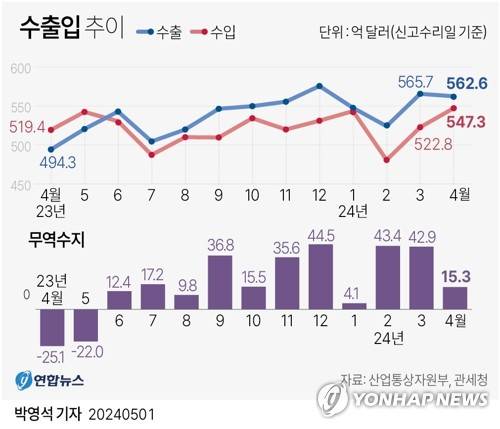 한국의 4월 수입액은 547억3천만달러로 작년 같은 달보다 5.4% 늘었다. 수입 증가는 작년 2월 이후 14개월 만이다. 이로써 4월 무역수지는 15억3천만달러 흑자를 기록했다.