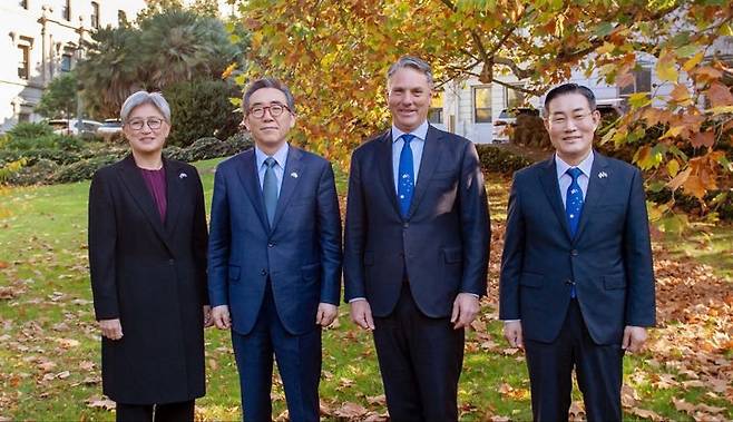 [서울=뉴시스] 김진아 기자 = 신원식 국방부 장관이 1일 호주에서 조태열 외교부 장관 및 호주 외교·국방장관과 기념 촬영하고 있다. 왼쪽부터 페니 웡 호주 외교장관, 조 장관, 리처드 말스 호주 부총리 겸 국방장관, 신 장관. (사진=국방부 제공) 2024.05.01. photo@newsis.com *재판매 및 DB 금지