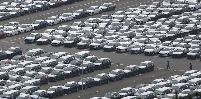 | ▲ 지난 1월 16일 현대자동차 울산공장 수출선적부두 옆 야적장에 완성차들이 대기하고 있다. |