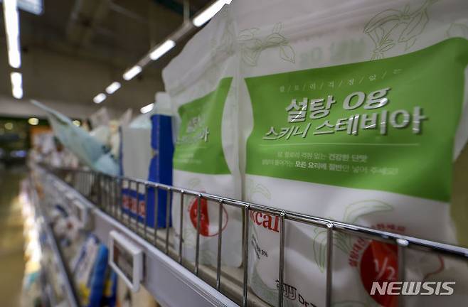 [서울=뉴시스] 정병혁 기자 = 2일 서울시내 대형마트에 대체당 제품이 진열되어 있다. 설탕 가격이 지속 상승하며 '슈가플레이션' 양상을 보이는 가운데 대체재인 알룰로스·대체당 등의 국내 판매량 급증해 눈길을 끌고 있다. 한국소비자단체협의회 물가감시센터 조사 결과 지난 1분기 설탕 가격은 전년 동기 대비 18.7% 오른 것으로 나타났다. 설탕 가격 상승세가 지속되자, 알룰로스·스테비아 등 대체당 판매량이 백설탕과 갈색 설탕을 앞섰다. 2024.05.02. jhope@newsis.com