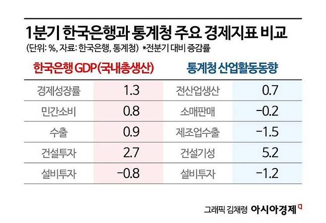 1분기 우리 경제성장률이 예상치를 크게 웃돌았지만 이후 발표된 산업활동지표는 오히려 둔화세를 보이면서 경기지표 해석을 두고 혼란이 일어나고 있다. 정부와 한국은행은 데이터 집계방식의 차이로 인해 양측의 통계수치가 일부 다르게 나타난 것일 뿐 우리 경제가 좋아지는 것은 맞다고 밝혔지만 향후 경기 불확실성은 이어질 것으로 예상된다.