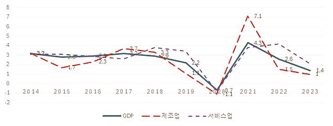 '표 1'에 나타난 추세를 보면 제조업은 성장률 변동성이 큰 업종임을 알 수 있다. 제조업은 세계시장 변동성(세계 수요의 흐름과 국가간 경쟁 압력)이 반영되어 있는 반면 서비스업은 내수 의존도가 높기 때문에 변동성이 상대적으로 작다. 한국 경제는 제조업이 성장을 추동하고 이를 반영하여 서비스업 수요의 변동성도 나타나며, 그 집계 결과가 GDP의 추이다. 그만큼 제조업이 중요하다.