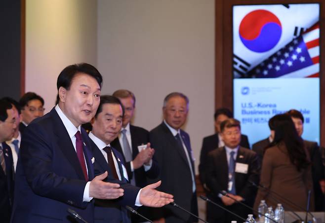 | ▲ 2023년 4월 25일(현지시간) 미국을 국빈 방문한 윤석열 대통령이 워싱턴DC 미국 상공회의소에서 열린 한미 비즈니스 라운드테이블에서 참석자들에게 착석을 권하고 있다. |