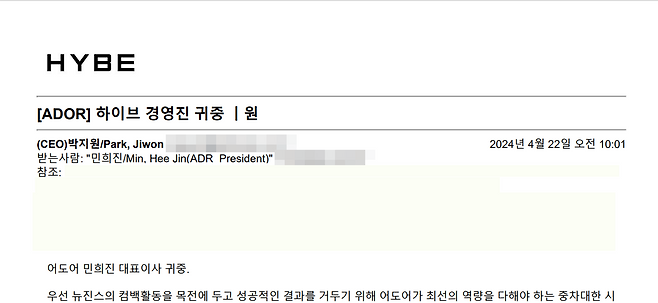 하이브:민 대표에게 22일 보낸 메일에 이미 상세히 답한 부분입니다. 당사는 아래와 같이 상세한 답을 보냈습니다.