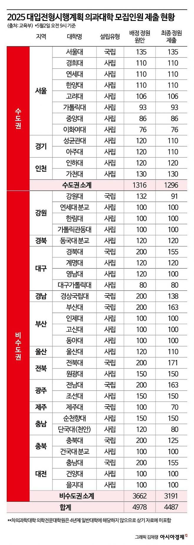 권역별로는 수도권 의대에서 앞서 배정된 1316명 정원에서 20명 줄어든 1296명이, 비수도권에서는 3662명에서 471명 줄어든 3191명이 제출됐다.